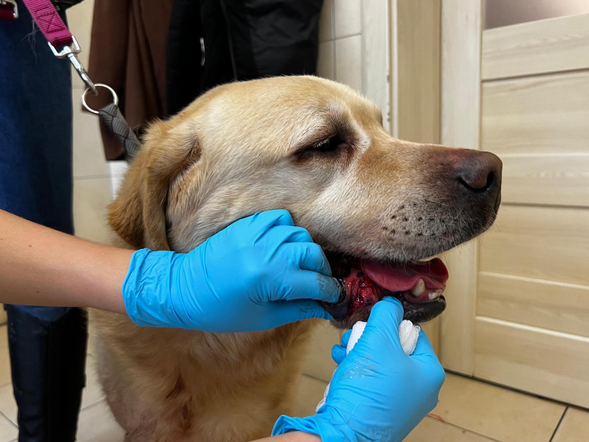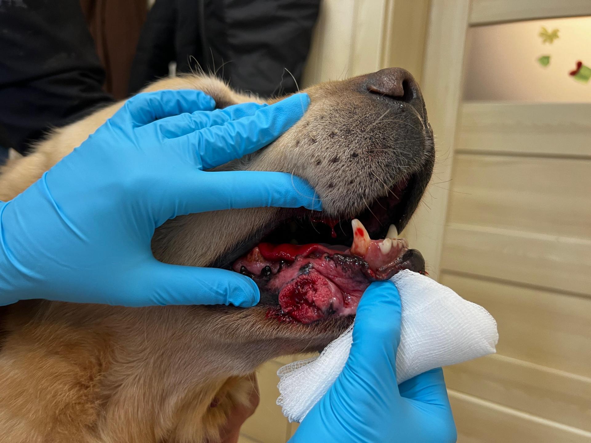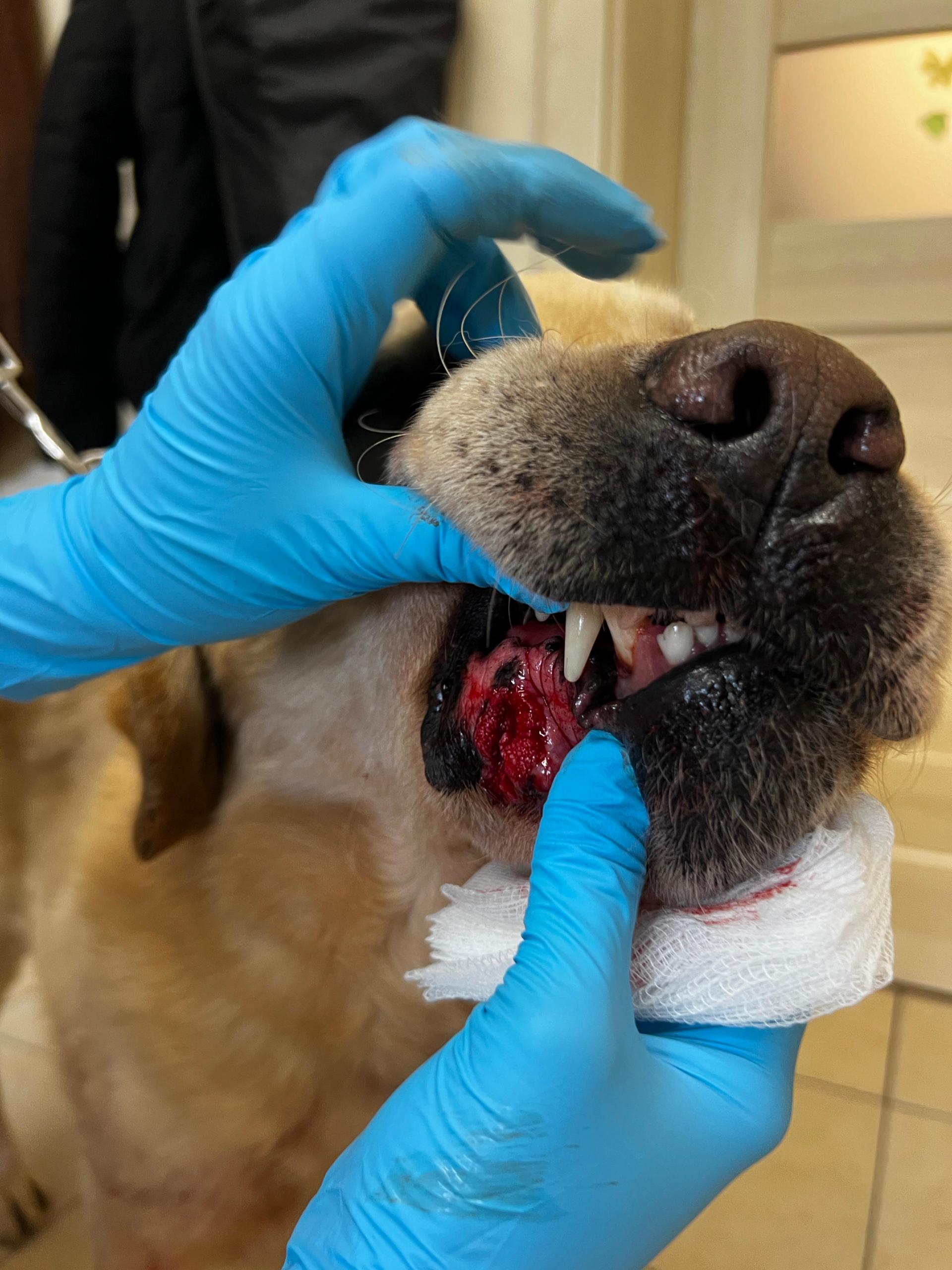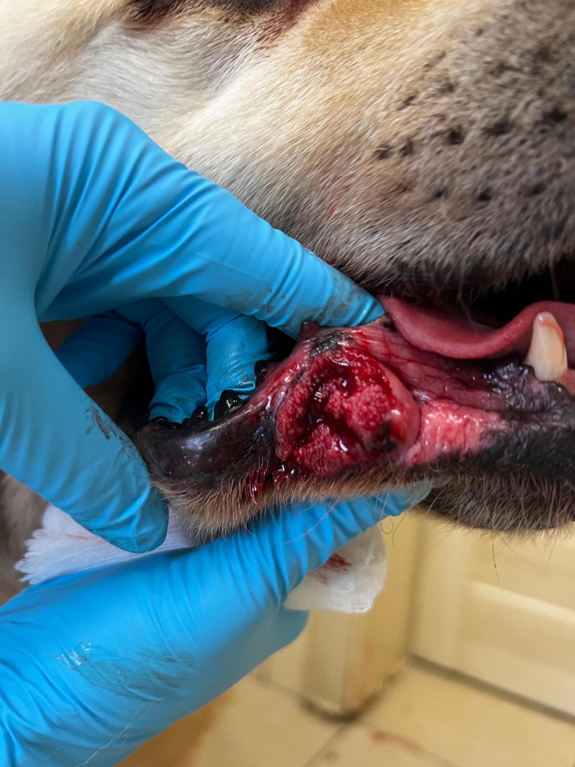 An seiner Unterlippe hat er eine schwere, blutende und eiternde Wunde ein Tumor .
